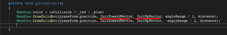 Handles.DrawSolidArc(transform.position, InitfowardVector, InitUpVector, angleRange / 2, distance);