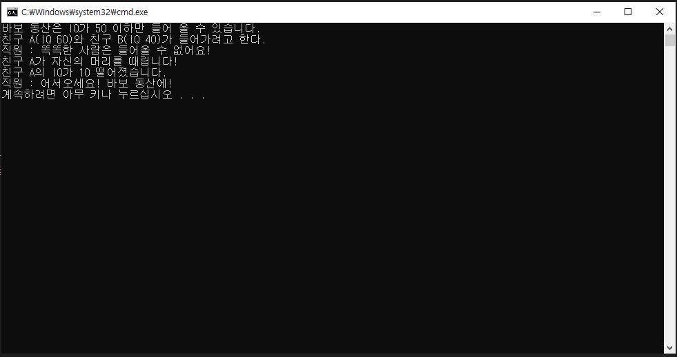 Console.WriteLine("직원 : 똑똑한 사람은 들어올 수 없어요!");