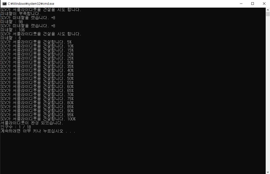 Console.WriteLine("{0}가 서플라이디폿을 건설을 시도 합니다.", unitSCV);